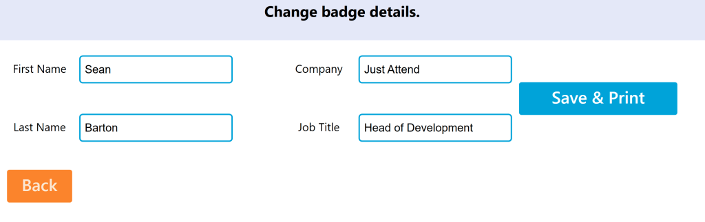 When enabled it will give the attendee a visual of how their badge will look when printed and the opportunity to change the information on the badge. Any changes they make are written back to the system back-end for full traceability.